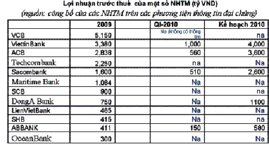 | Nhìn vào mức lợi nhuận công bố trong năm 2009 và quý I/2009 của rất nhiều NHTM VN cho thấy, ngay cả khi DN khó khăn, các NHTM vẫn lãi đáng kể |