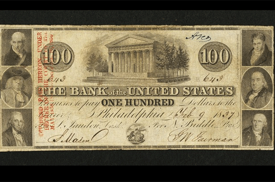 Trong những năm đầu tiên của Hợp chủng quốc Hoa Kỳ, định chế gần với một ngân hàng trung ương nhất mà nước này có là “Bank of the United States”. Đầu tiên, ngân hàng này được Chính phủ liên bang trao quyền in tiền trong giai đoạn từ 1971-1811, tiếp đó là giai đoạn 1816-1836. Sau đó, “Bank of the United States” đã được chính quyền bang Pennsylvania trao quyền in tiền ở bang này, phát hành tờ 100 USD như ở hình trên.