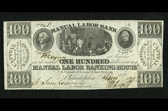 Trong khoảng thời gian giữa Cách mạng và Nội chiến Mỹ, tiền giấy do các nhà băng phát hành chiếm phần lớn lượng tiền giấy lưu thông ở nước này. Hệ thống tiền tệ này có xu hướng dẫn tới hiện tượng rút vốn ồ ạt tại các ngân hàng, vì các ngân hàng thường không có đủ vàng bạc để bảo đảm cho đồng tiền mà họ phát hành. Nhiều ngân hàng đã đổ vỡ, bao gồm ngân hàng Manual Labor Bank - ngân hàng phát hành tờ 100 Đô la này.
