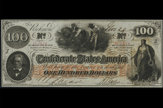 Đây là đồng tiền 100 Đô la do phe miền Nam phát hành năm 1862 trong cuộc Nội chiến Mỹ. Sau khi phe miền Nam thất bại trong cuộc chiến này, đồng tiền do họ phát hành trở nên vô giá trị.