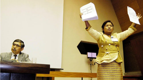 Chị Maliwan với hơn 300 giấy chứng tử của người dân Mae Moh trong kỳ họp lần 40 của ADB tại Nhật - Ảnh: Greenpeace |