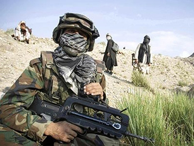 Trong ảnh: Một phiến quân Taliban khoe chiến lợi phẩm là sắc phục và súng của lính Pháp. Ảnh: THE TIMES