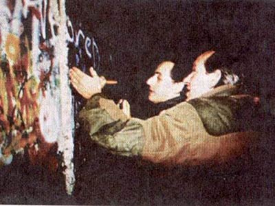 Bức ảnh cũ về ông Sarkozy (trái) và người bạn cạnh bức tường Berlin. Ảnh: AFP