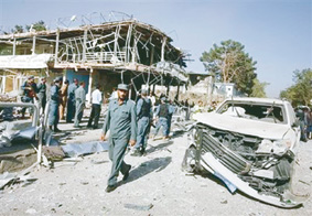 Một chiếc xe của LHQ bị phá hủy trong vụ đánh bomtrước cửa Đại sứ quán Ấn Độ tại Afghanistan ngày 8-10-2009. |