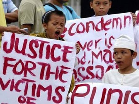 Trẻ em Philippines tham gia cuộc biểu tình phản đối cuộc thảm sát ngày 23-11. Ảnh: AFP