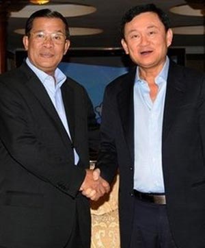 Thủ tướng Campuchia Hun Sen (trái) tiếp ông Thaksin Shinawatra tại Phnom Penh hôm 11-11. Ảnh: AFP