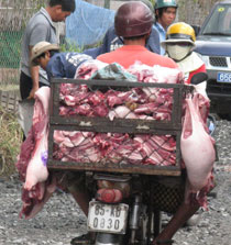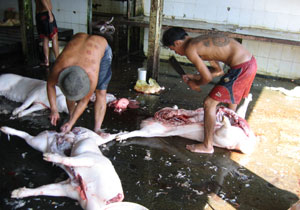 Đến những lò giết mổ tập trung vào khoảng 9g sáng, nhiều xe honđa chở thịt heo đi tiêu thụ ra vào tấp nập, thịt để sau xe, có miếng còn lòng thòng, kéo lê dưới đất. Những người trực tiếp mổ heo chỉ mặc độc chiếc quần đùi, xẻ thịt bày ra sàn và kéo lê thịt dưới sàn. Người mổ thịt nói lò này có quy mô 400 con heo/ ngày, phần lớn là tư nhân bên ngoài vào thuê. Dân sống quanh lò mổ nói” Lò mổ nhộn nhịp nhất vào 1,2 giờ sáng, nước thải, mùi hôi của lò mổ rất nặng nề, dân tình không ai chịu nổi”. Quan sát khu vực các hầm chứa nước thải của lò mổ, tất cả đều là lộ thiên, cũ kỹ, lạc hậu, ruồi nhặng, muỗi làm chủ khu vực hầm chứa nước thải.