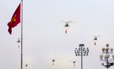 Mở màn phần diễu binh, diễu hành là 10 máy bay trực thăng mang cờ Đảng, Tổ quốc và dòng chữ “Kỷ niệm 1000 năm Thăng Long- Hà Nội”.